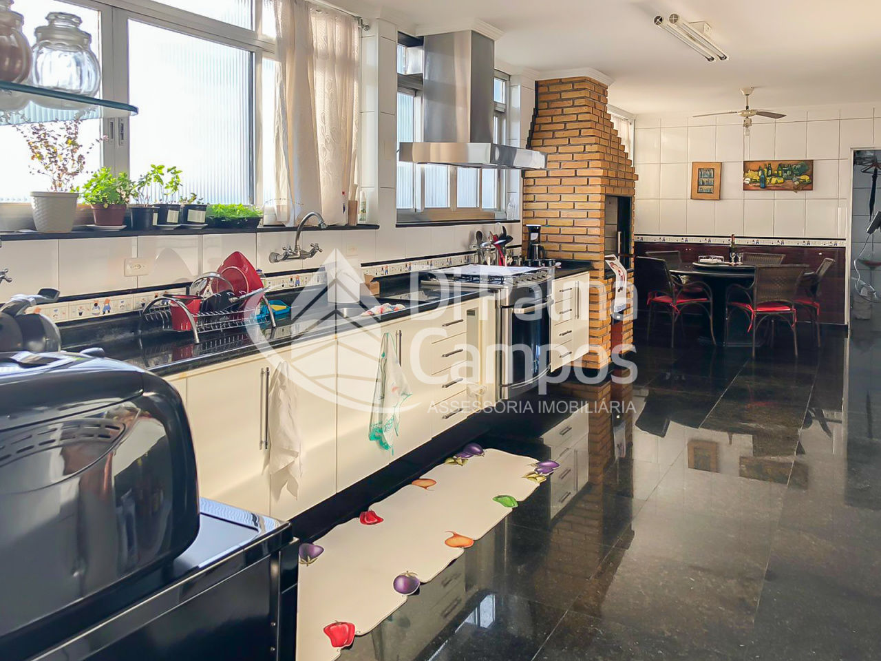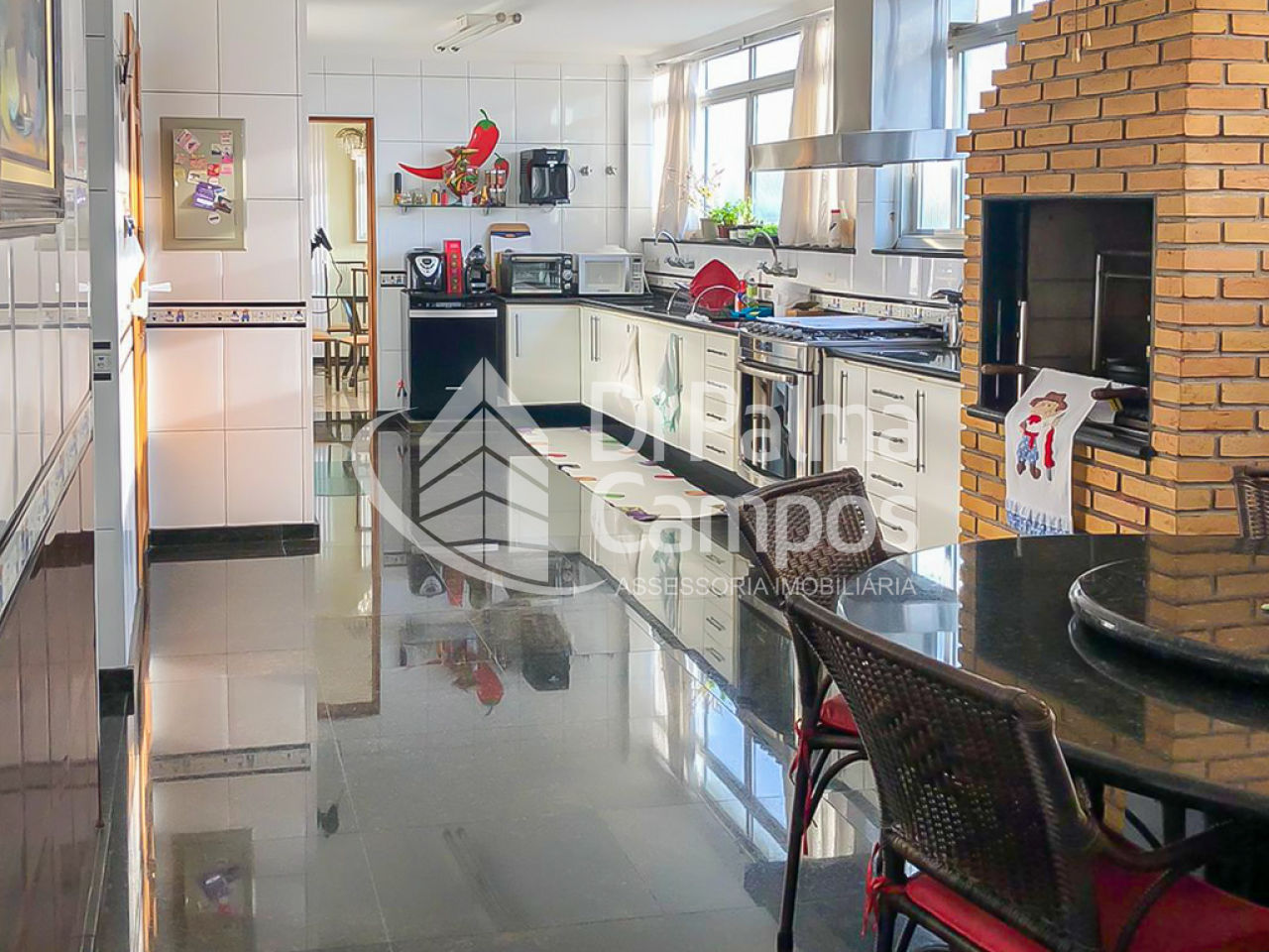 A cozinha é ampla e funcional, com acesso à churrasqueira, além de área de serviço independente com despensa. O imóvel oferece três vagas de garagem definidas, atendendo famílias que necessitam de comodidade para mais de um veículo.