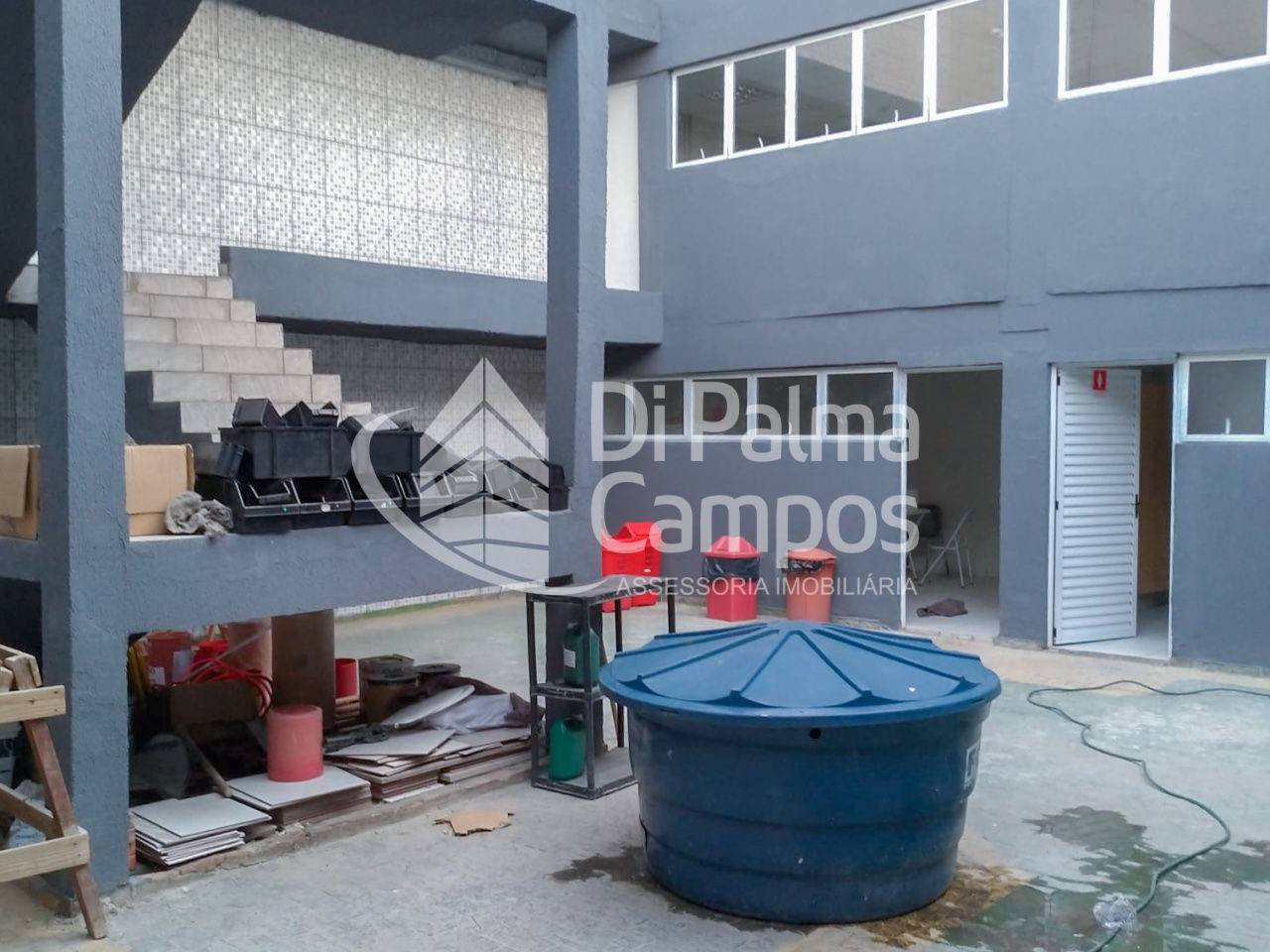 No térreo, há vagas de garagem frontais para três veículos, acesso lateral para o salão principal com porta de aço de grandes dimensões, salão com aproximadamente 198 m² e pé-direito elevado, além de mezanino em formato em L. O pavimento conta ainda com áreas de apoio, salas laterais, corredor de acesso, quintais e conjuntos de banheiros equipados com chuveiros, atendendo bem operações com grande fluxo de pessoas.