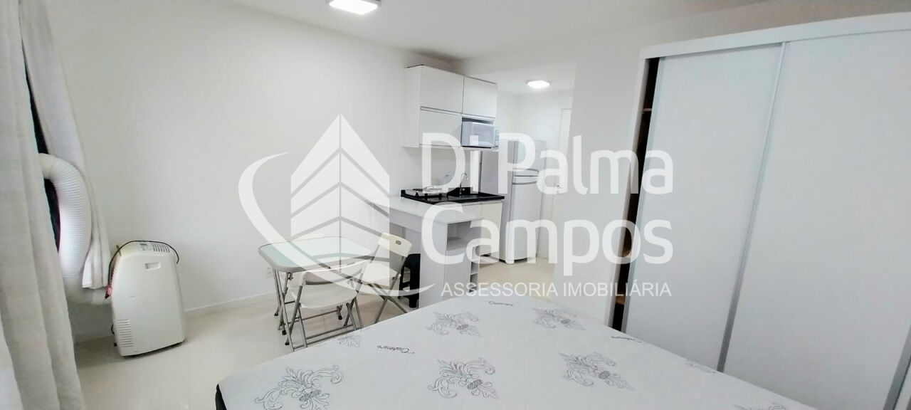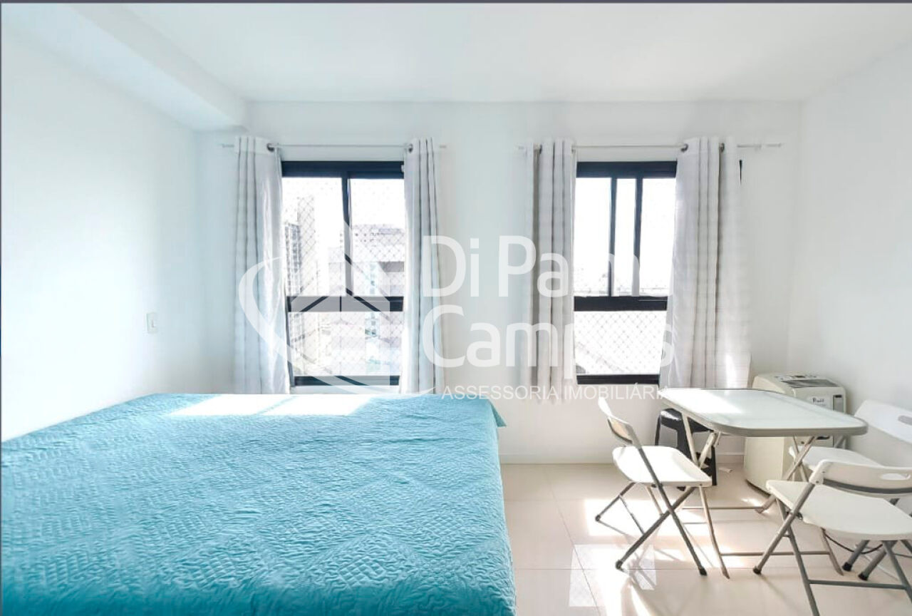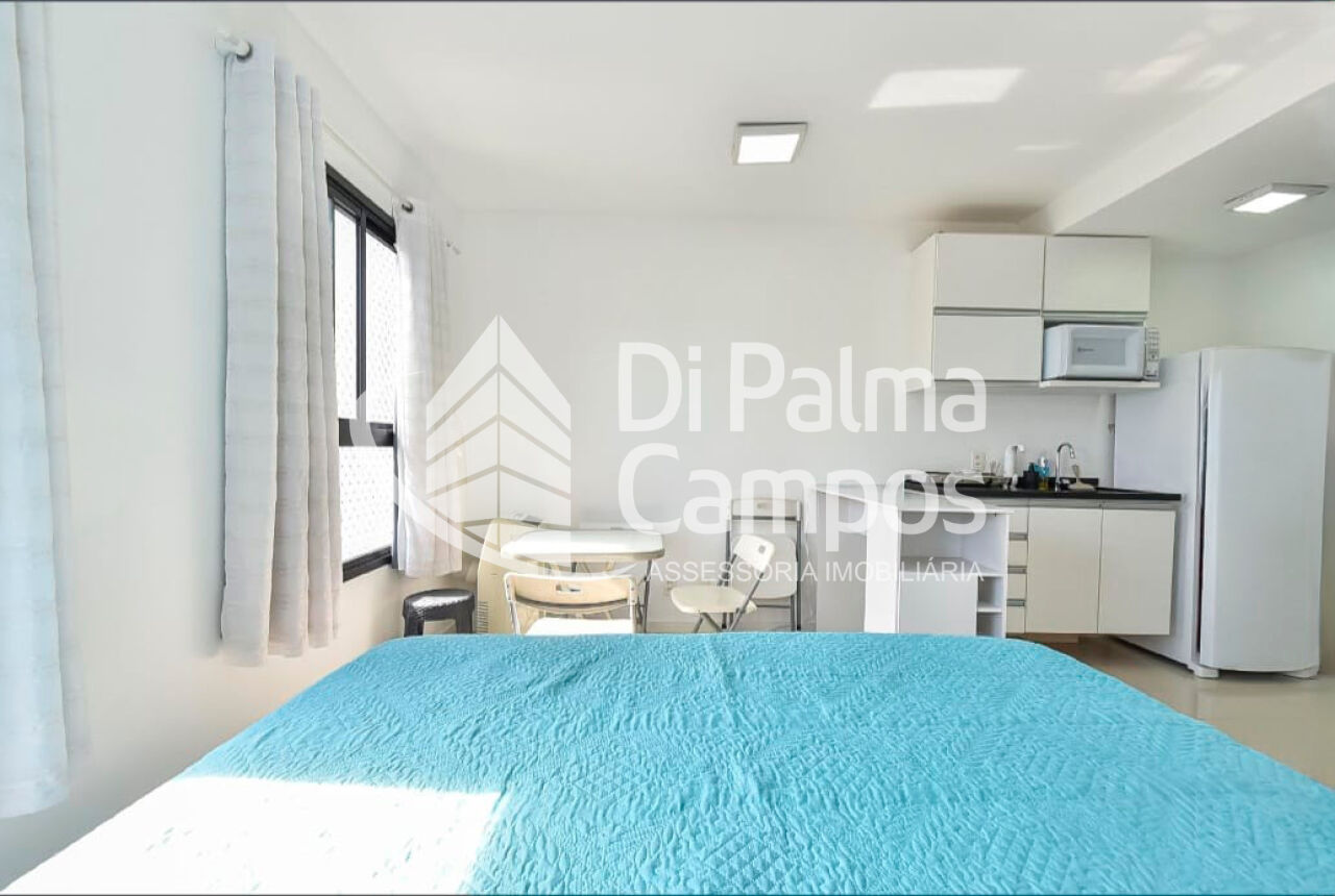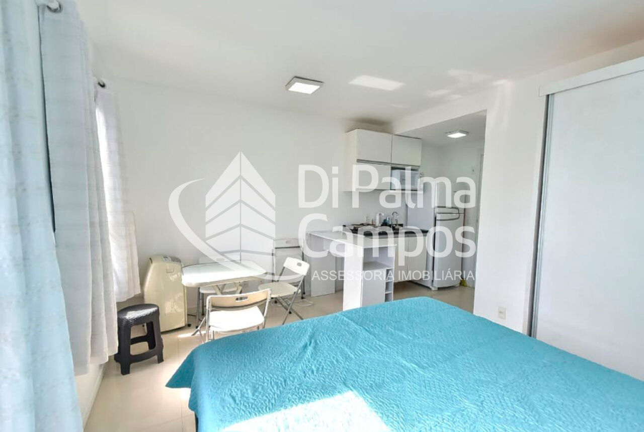 O apartamento possui 1 quarto integrado ao ambiente principal e 1 banheiro com armário, box em vidro e chuveiro eletrônico. O piso em porcelanato valoriza o espaço e facilita a manutenção. São duas janelas com cortinas e black-out, além de ar-condicionado instalado.