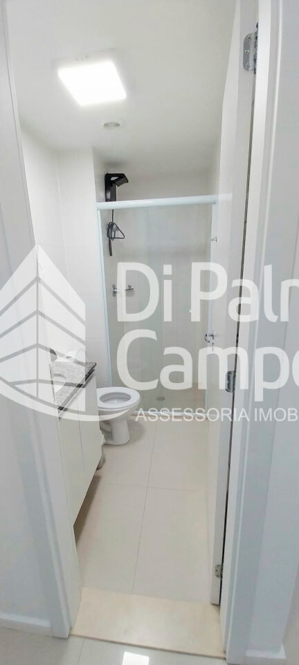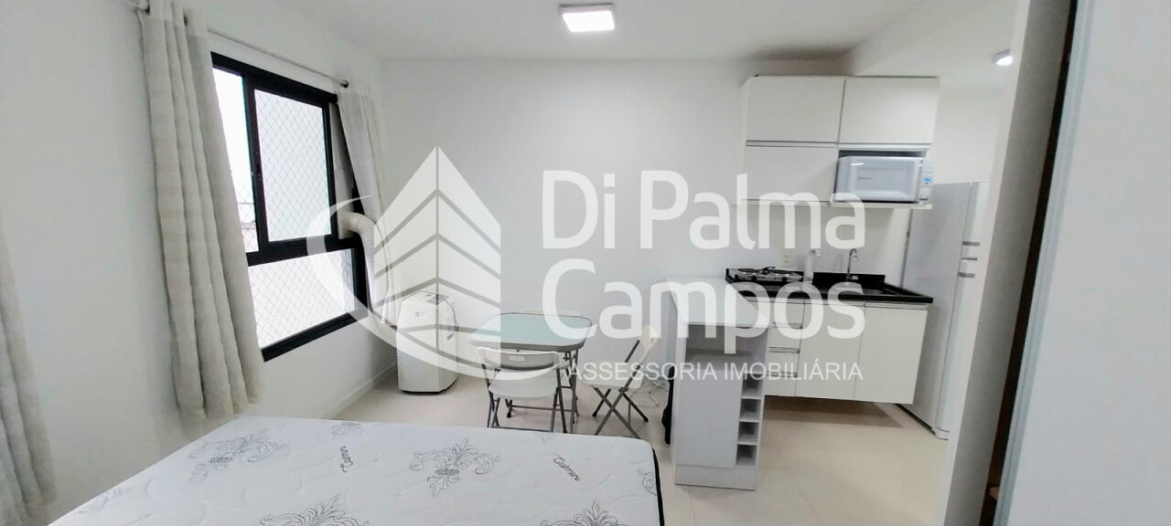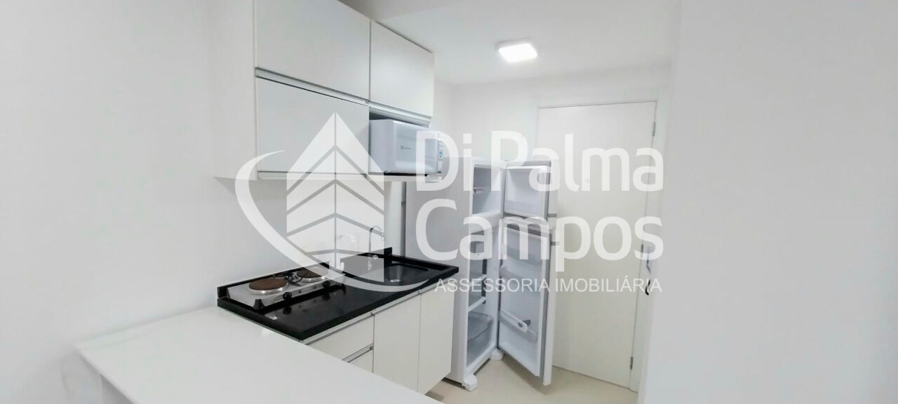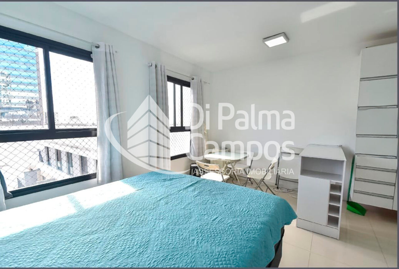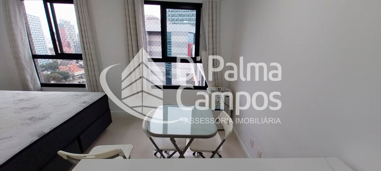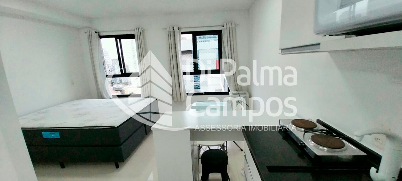 O apartamento possui 1 quarto integrado ao ambiente principal e 1 banheiro com armário, box em vidro e chuveiro eletrônico. O piso em porcelanato valoriza o espaço e facilita a manutenção. São duas janelas com cortinas e black-out, além de ar-condicionado instalado.