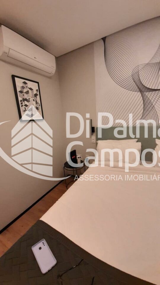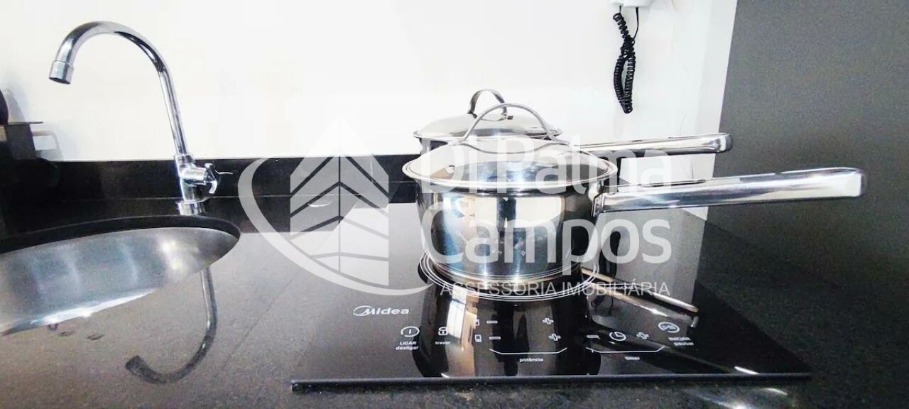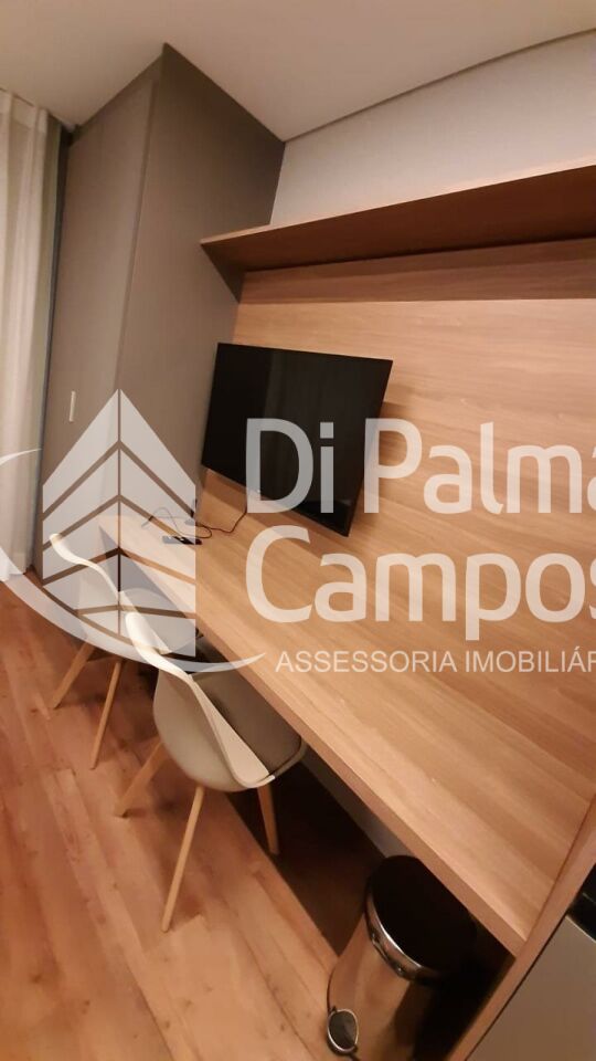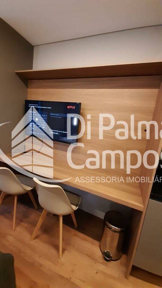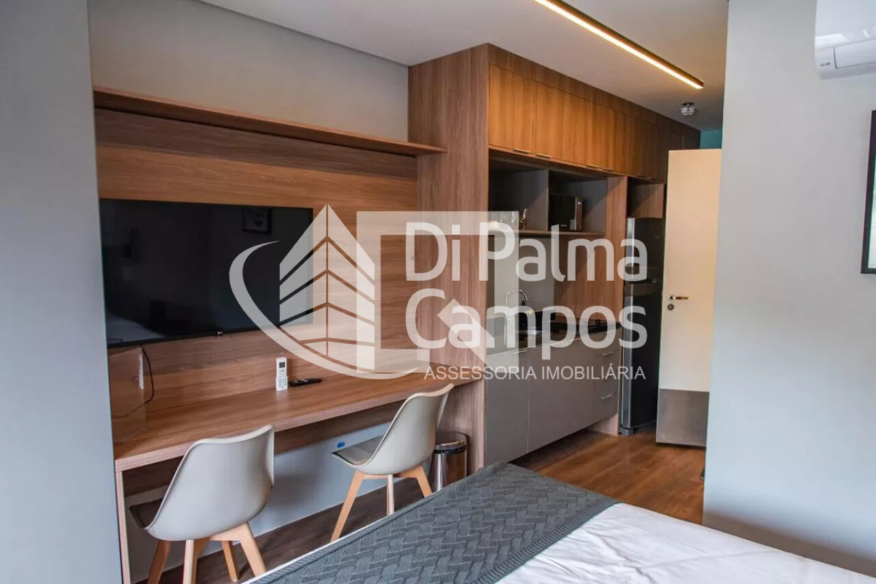 A cozinha possui bancada com pia, armários e espaço bem aproveitado, integrando-se ao restante do ambiente. O espaço conta ainda com mesa de trabalho e TV instaladas, permitindo utilizar o apartamento tanto para moradia quanto para home office. O dormitório acomoda cama de casal e possui ar-condicionado, proporcionando conforto em todas as estações. O imóvel está localizado no 1º andar.
