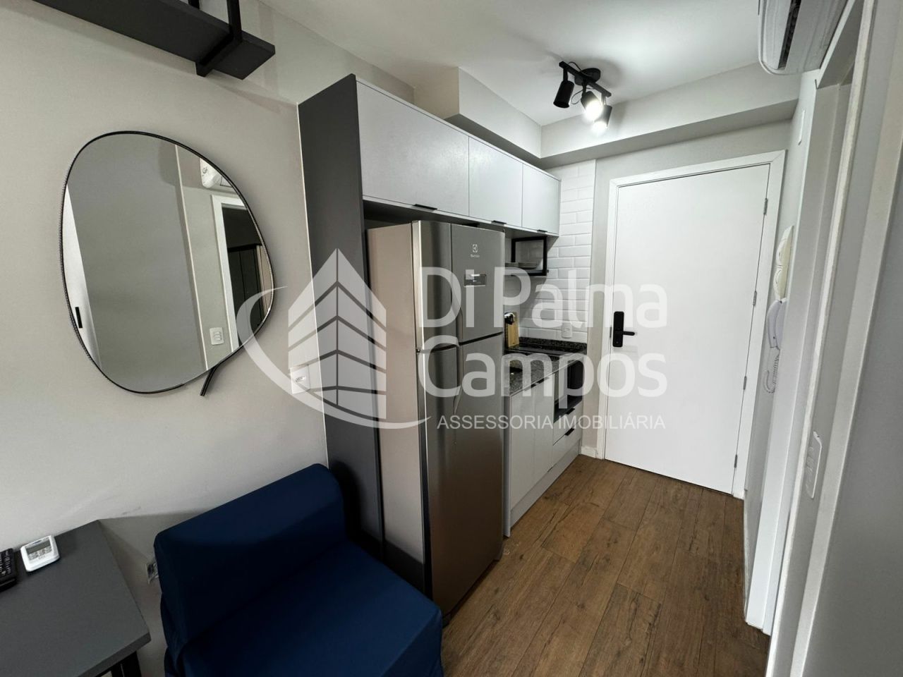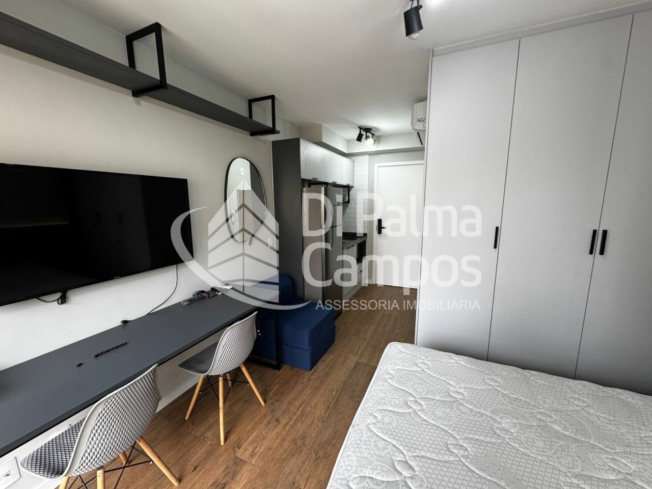 Este studio mobiliado de 22 m² de área útil oferece praticidade e conforto para quem deseja alugar um espaço moderno e eficiente. O imóvel conta com quarto com armário planejado, cama, cozinha equipada com armários, geladeira e fogão por indução, além de banheiro bem distribuído e uma pequena sacada. A fechadura eletrônica complementa a segurança e a funcionalidade do dia a dia, ideal para quem busca um lar compacto, mas completo.