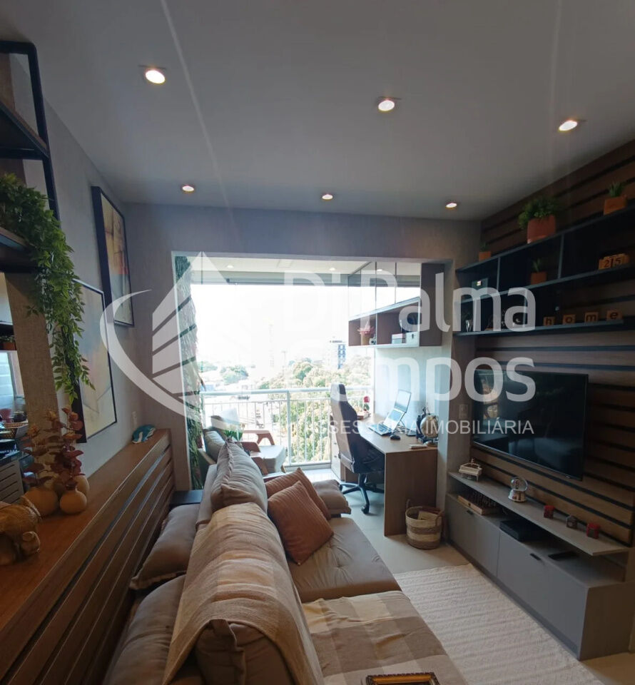 O imóvel possui área útil de 45 m², está totalmente mobiliado, decorado e modernizado, pronto para morar ou investir em locação. A planta contempla sala ampliada integrada à sacada, com ar-condicionado e acabamento em piso porcelanato, proporcionando um ambiente bem distribuído.