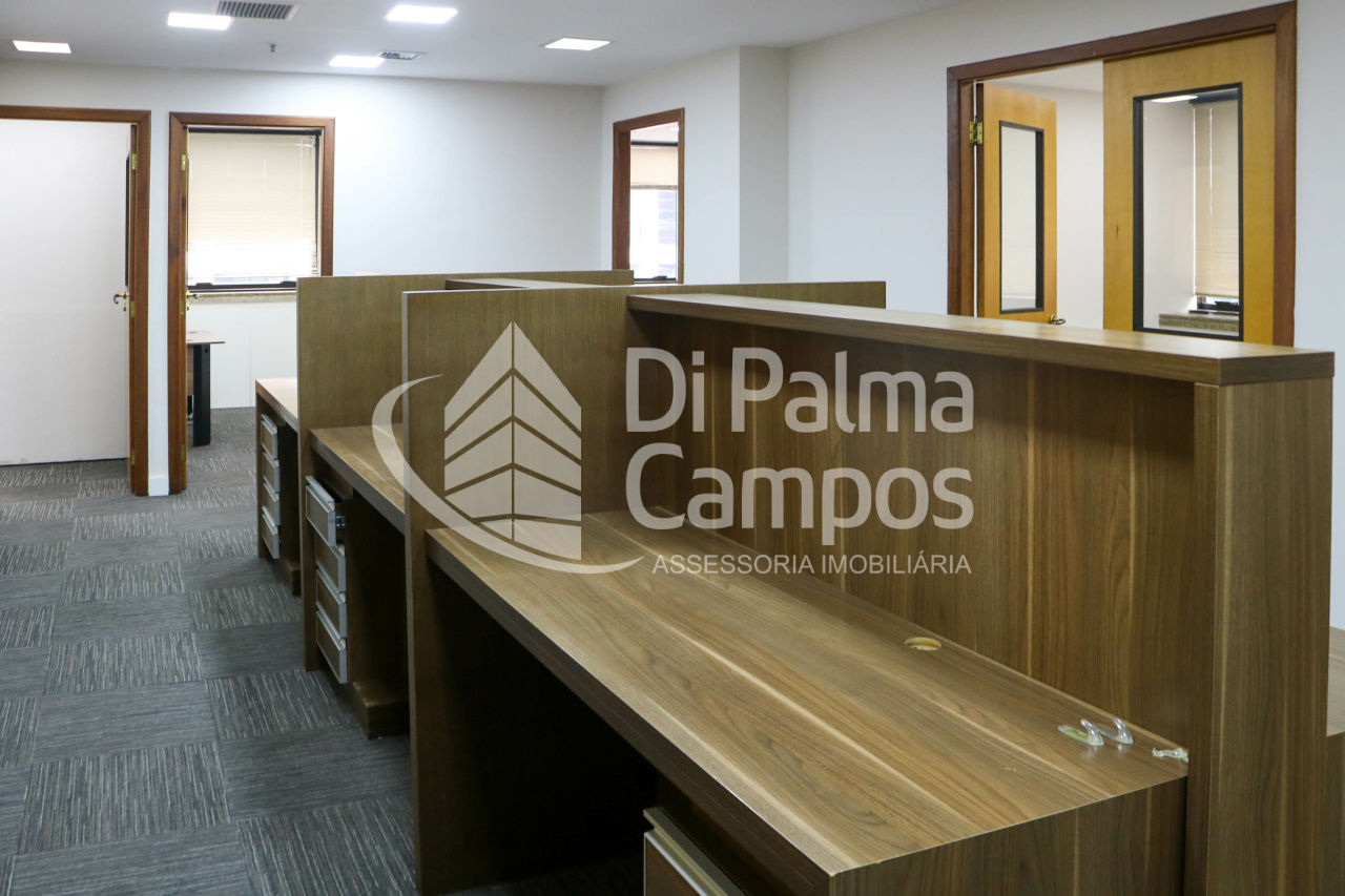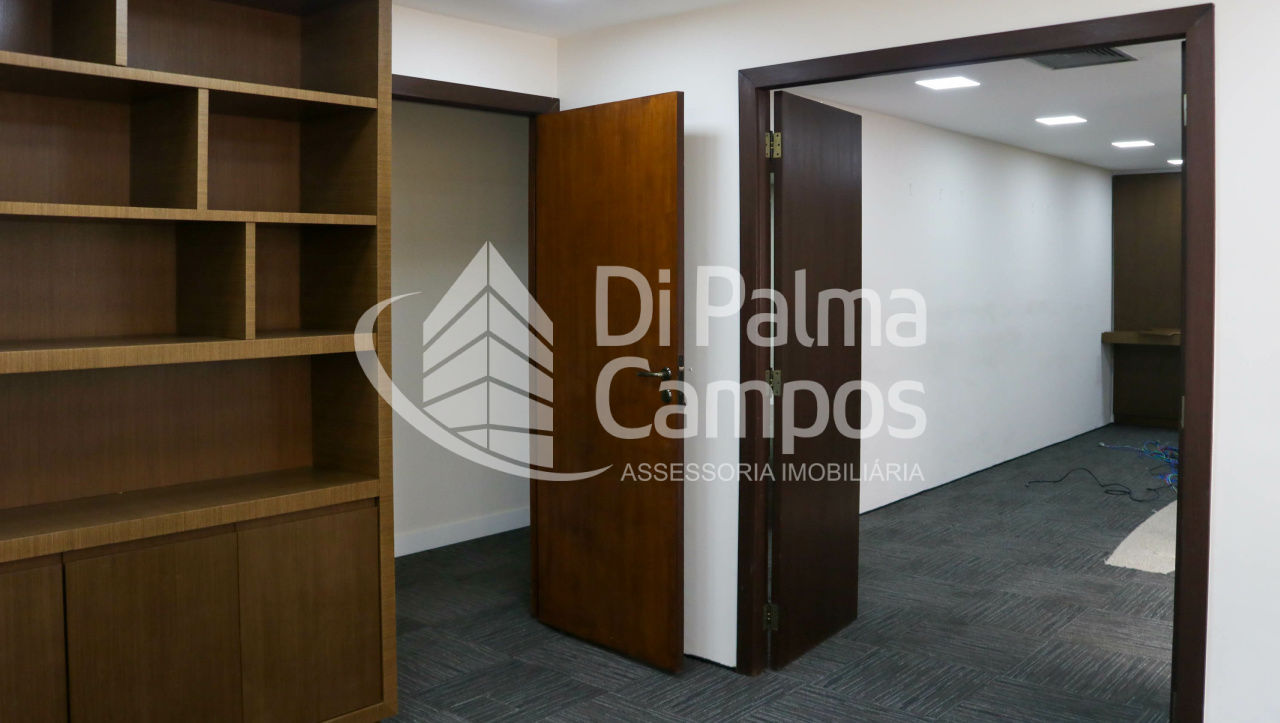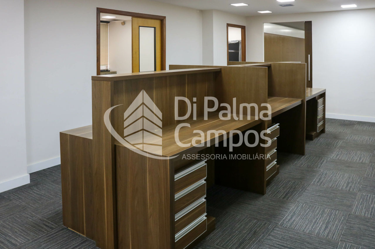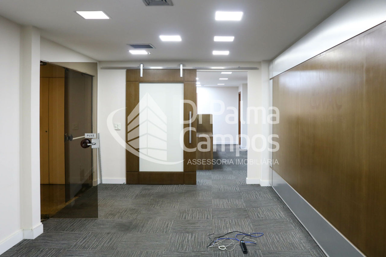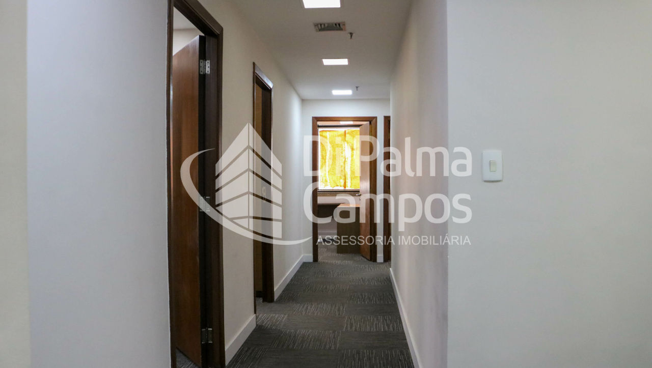 Disponível para locação, o conjunto conta com 164 m² de área útil, distribuídos em 8 salas que permitem a separação de setores, salas de reunião ou atendimento. O espaço apresenta piso em carpete modular, forro com iluminação embutida, ar-condicionado e divisórias já instaladas, além de marcenaria em alguns ambientes que contribui para a organização.